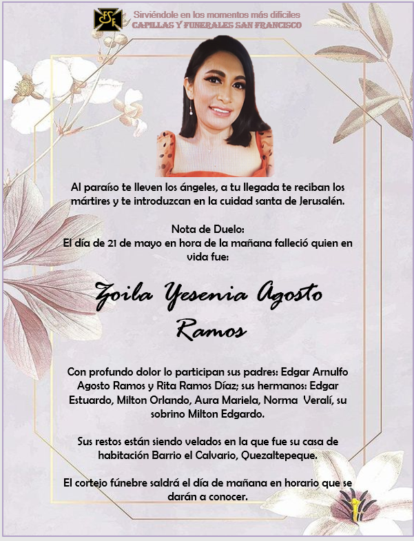 Zoila Yesenia Agosto Ramospor Sanf7391mayo 21, 2022mayo 21, 20223 comentarios 3 comentarios en «Zoila Yesenia Agosto Ramos» Jeniffer Martinez Ramos el mayo 21, 2022 a las 6:04 pm Responder Mi sentidas condolencias que dios les de resignación a sus familiares 🙏 Rony el mayo 21, 2022 a las 6:44 pm Responder Mi mas sentido pesame resignacion a la familia se nos adelanto una gran persona,maravillosa amiga dele señor el eterno descanso y perdure para siempre la luz eterna amen Susy Ramirez el mayo 21, 2022 a las 7:48 pm Responder Mis más sinceras condolencias a la familia Agosto. Dios les de la fortaleza en tan dura prueba Deja una respuesta Cancelar la respuestaTu dirección de correo electrónico no será publicada. Los campos obligatorios están marcados con *Nombre * Correo electrónico * Web Comentario *