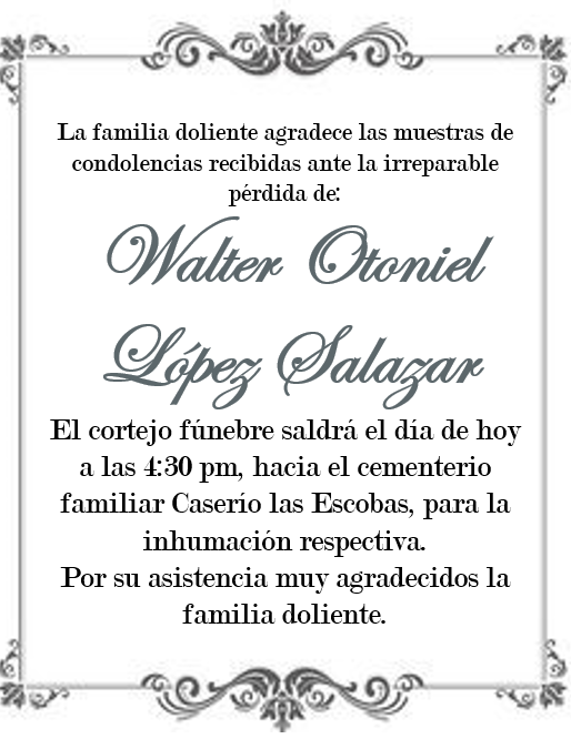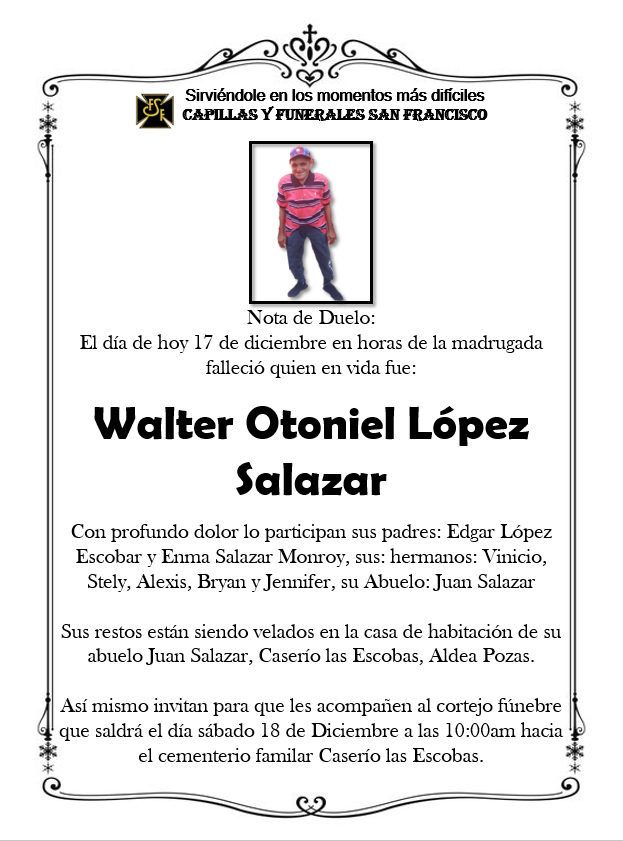 Walter Otoniel López Salazarpor Sanf7391diciembre 17, 2021diciembre 18, 20211 comentario 1 comentario en «Walter Otoniel López Salazar» Ulises Moises Pinto Sagastume el diciembre 17, 2021 a las 10:47 pm Responder Dios lo tenga en gloria Mis más sinceras condolencias Deja una respuesta Cancelar la respuestaTu dirección de correo electrónico no será publicada. Los campos obligatorios están marcados con *Nombre * Correo electrónico * Web Comentario *