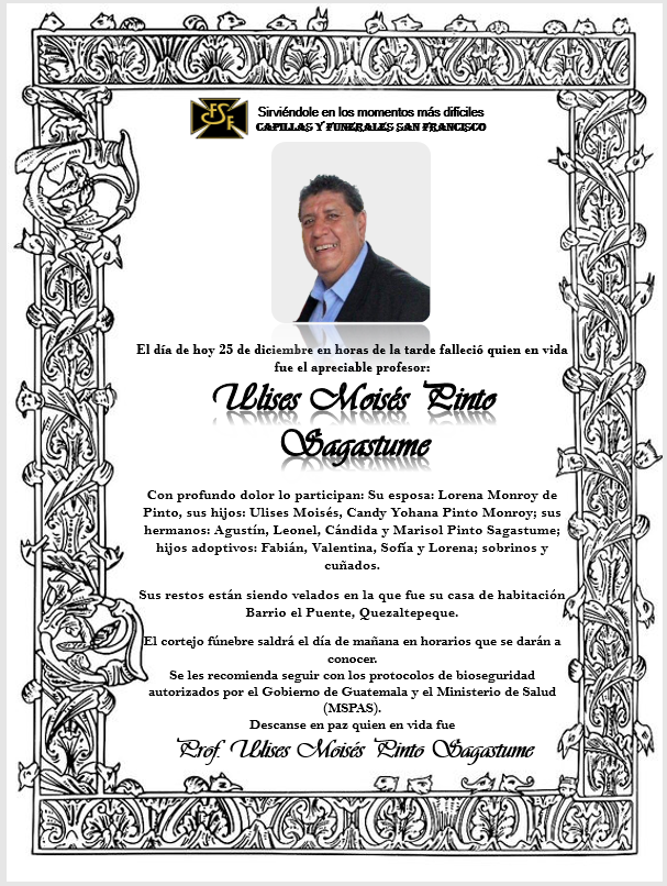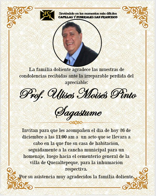Nuestras más sentidas condolencias por el fallecimiento de Ulises, para la familia Pinto Sagastume, su esposa, hijos. Pedimos a nuestro señor les brinde el consuelo y resignación por tan irreparable pérdida.