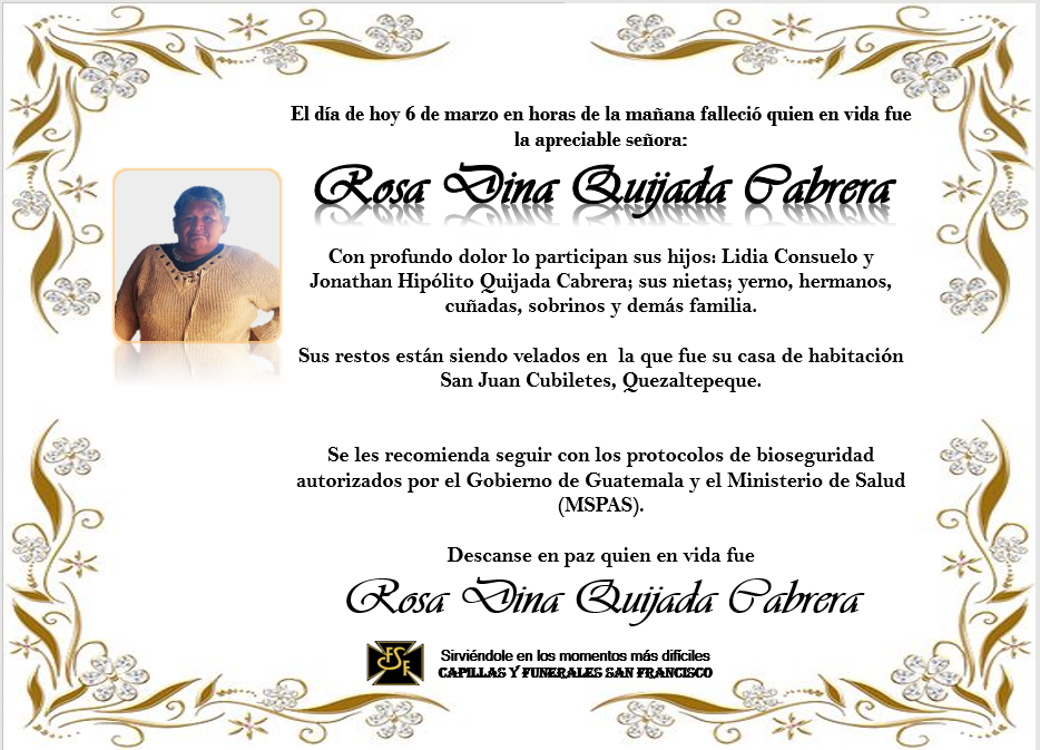 Rosa Dina Quijada Cabrerapor Sanf7391marzo 6, 2022marzo 6, 2022 Deja una respuesta Cancelar la respuestaTu dirección de correo electrónico no será publicada. Los campos obligatorios están marcados con *Nombre * Correo electrónico * Web Comentario *